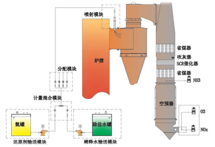 單純的SNCR 工藝為了滿足對氨逃逸量的限制,要求該工藝還原劑的噴入點必須嚴(yán)格選擇在適宜反應(yīng)的溫度區(qū)域內(nèi)。而在混合SNCR - SCR技術(shù)中, SNCR過程中形成的氨泄漏是作為SCR反應(yīng)的還原劑來設(shè)計的,因此,對SNCR階段氨逃逸的問題的考慮可以大大放寬。相對于獨立的SNCR工藝,混合工藝氨噴射系統(tǒng)可布置在適宜的反應(yīng)溫度區(qū)域稍前的位置, 從而延長還原劑的停留時間。在SNCR過程中未完全反應(yīng)的氨將在位于下游的SCR反應(yīng)器被進一步利用?;旌瞎に嚨倪@種安排,有助于提高SNCR階段的脫硝效率。